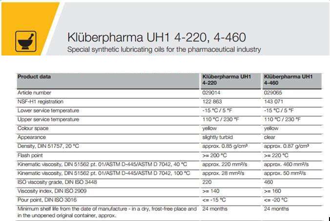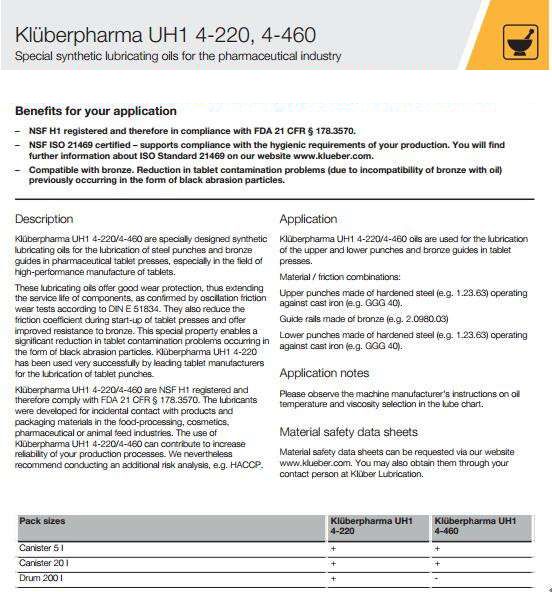 Kluberpharma UH1 4-220、 4-460醫(yī)藥工業專用合成潤滑油,專門用于制藥行業的潤滑平闆打孔和壓片機(壓片),特别是生(shēng)産高功率的青銅指南(nán)。