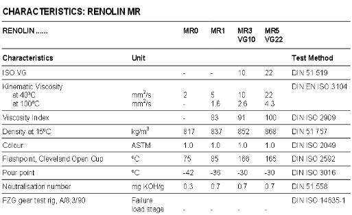 RENOLIN MR 3機床主軸車削600轉下(xià),紡織機主軸旋轉低(dī)于10,000 RPM。 RENOLIN MR 5,RENOLIN MR 10,RENOLIN MR 15,重型液壓油甚至能(néng)夠承受超過100℃連續溫度可達120℃的時(shí)間(jiān)很短,他們建議(yì)由液壓設備的領先制造商(shāng),并在某些(xiē)情況下(xià),工廠填充。 RENOLIN MR 10也(yě)适用于動力轉向系統。 RENOLIN MR 10,RENOLIN MR 15 RENOLIN MR 20建議(yì)為(wèi)中型傳輸,特别是那些(xiē)與電磁,多離合器(qì)裝。 RENOLIN MR 30 RENOLIN MR 40重型變速器(qì)齒輪潤滑的建議(yì)。