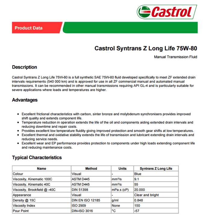 Castrol Syntrans Z Long Life 75W-80是全合成SAE 75w-80專門滿足ZF擴展漏
